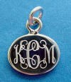 Sterling silver oval wide charm with interlock font monogram. |