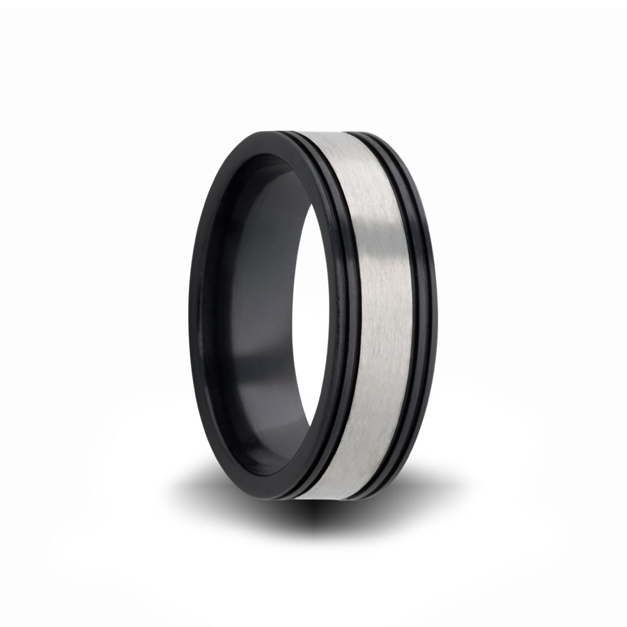 | Flat Two Tone Zirconium Wedding Ring With Three Center Grooves in Satin Finish |