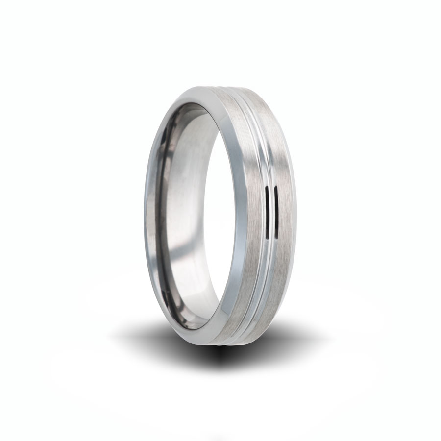 Domed Tungsten Carbide Wedding Ring with Two Center Grooves in Satin Finish with Bevel Edges |